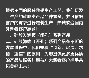 我公司生產(chǎn)的硅膠海綿(開孔)系列產(chǎn)品具有耐高溫、透氣性好、耐壓性強(qiáng)等優(yōu)點(diǎn),是西服及高檔服裝整燙生產(chǎn)的必備產(chǎn)品。硅膠發(fā)泡板(閉孔)系列產(chǎn)品具有發(fā)泡均勻,耐高溫、耐壓性能好,其中新研制開發(fā)的針孔浮點(diǎn)硅膠發(fā)泡板攻克了一般產(chǎn)品的浮點(diǎn)不飽滿的技術(shù)難題,一般產(chǎn)品的浮點(diǎn)不飽滿,容易擋住透氣孔,造成吸風(fēng)效果不良。我司的產(chǎn)品具有更好的透氣性和回彈性,以及更長時間的試用壽命。